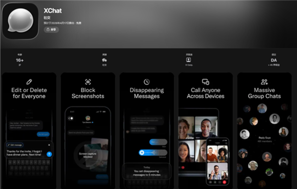 而正版XChat目前仅在App Store开放预约,计划于4月17日全球正式推出,安卓版本上架时间暂未公布。 这款被称作“马斯克版微信”的应用,是独立于X平台的私密通讯工具,大小约175.8MB,iOS 26 及以上系统,支持简体中文等45种语言。 采用Rust语言开发,主打端到端加密、无广告、无用户追踪,还具备语音视频通话、阅后即焚、禁止截图、481人大群聊等功能,定位为西方市场一站式超级应用。