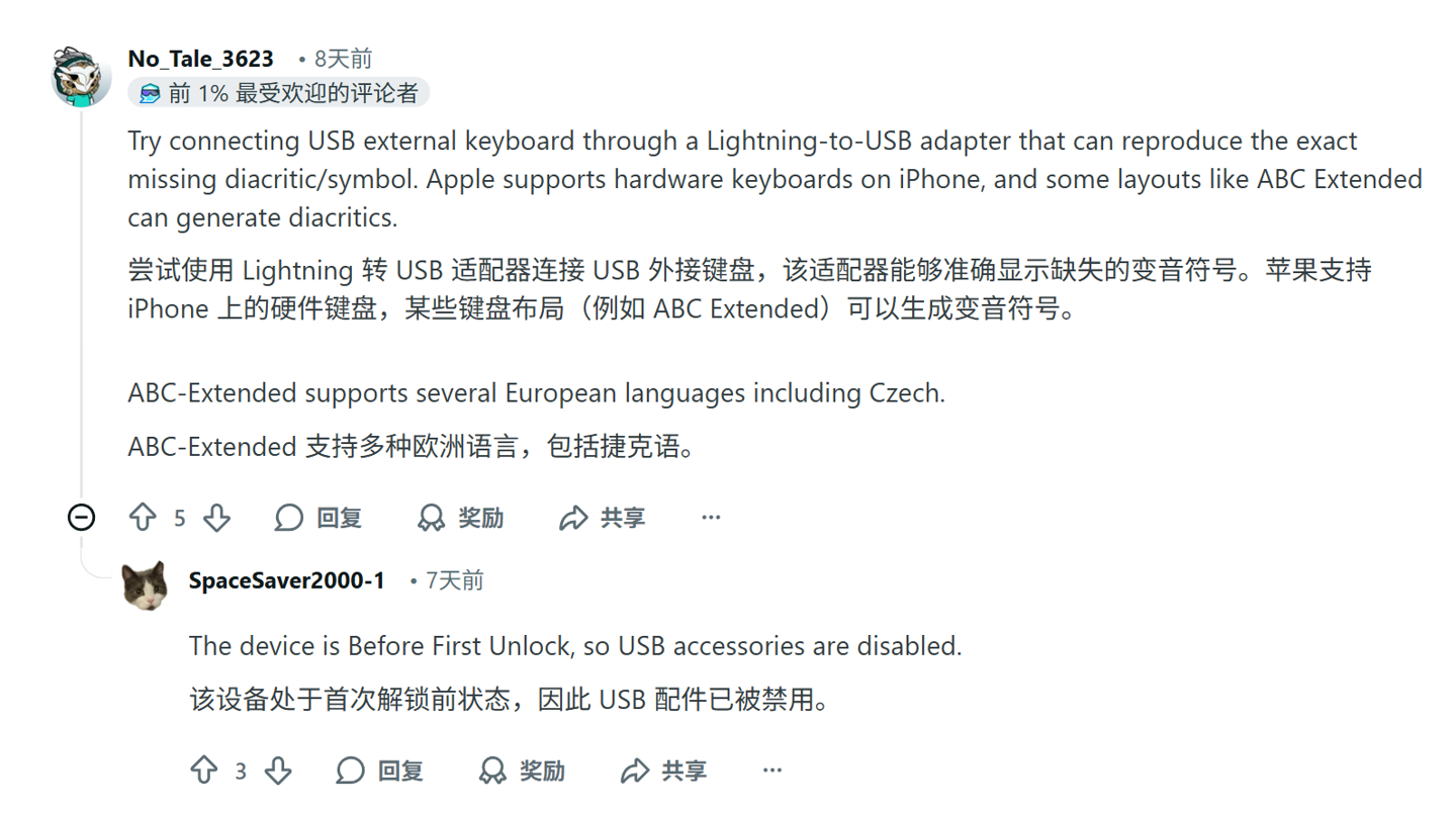 这名用户表示,他之前一直使用捷克语键盘,手机的密码包含特殊字符 háček(IT之家注:抑扬符,即“ˇ”)。但升级 iOS 26.4 后,这个字符从键盘中消失了,导致他再也无法解锁手机。