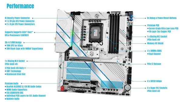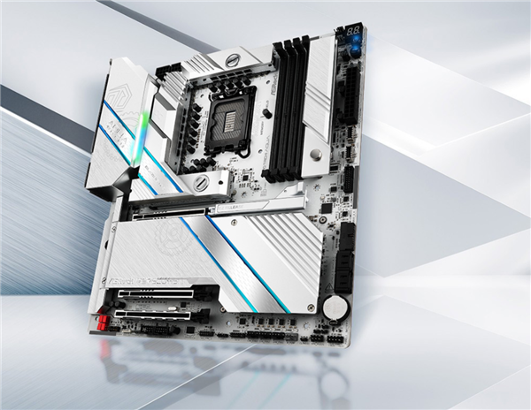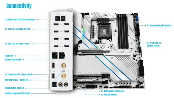 其他方面,这块板子还有28+1+2相供电(核心110A电流)、水冷/混合散热、四条DDR5-9200、两条PCIe 5.0 x16、一条PCIe 4.0 x16、两个PCIe 5.0 x4 M.2、四个PCIe 4.0 x4 M.2(Hyper M.2)、四个SATA 6Gbps、Marvell AQC113 10G万兆、Realtek RTL8126 2.5千兆、Wi-Fi 7,等等。
