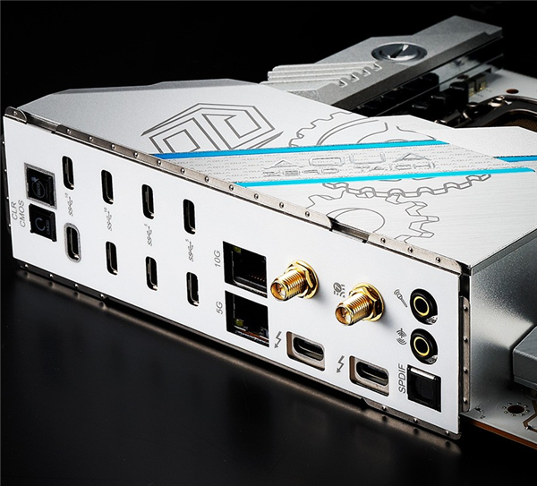 华擎这款Z890太极水冷主板的背部提供了8个USB-C,分为三种规格:两个支持USB4/雷电4 40Gbps,两个支持USB 3.2 Gen2 10Gbps、四个支持USB 3.2 Gen1 5Gbps,都标注了传输速度,方便区分。