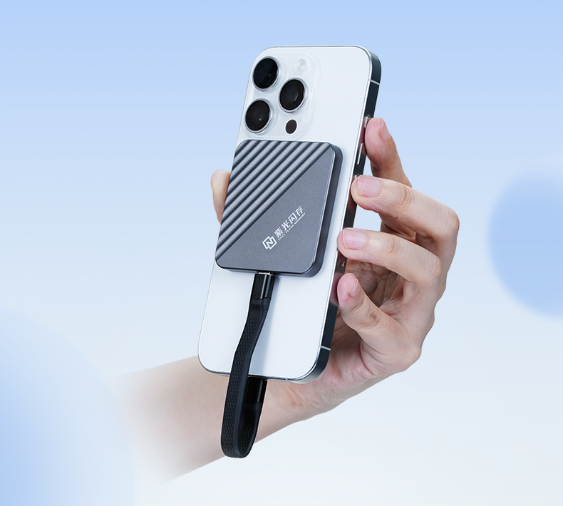 紫光闪存 UNIS PN C2 采用磁吸设计,可以贴合在 iPhone 等产品背面,厚度 7mm、重量 39g,体积相当于一块曲奇饼干,可选深邃蓝、典雅灰两款配色。
