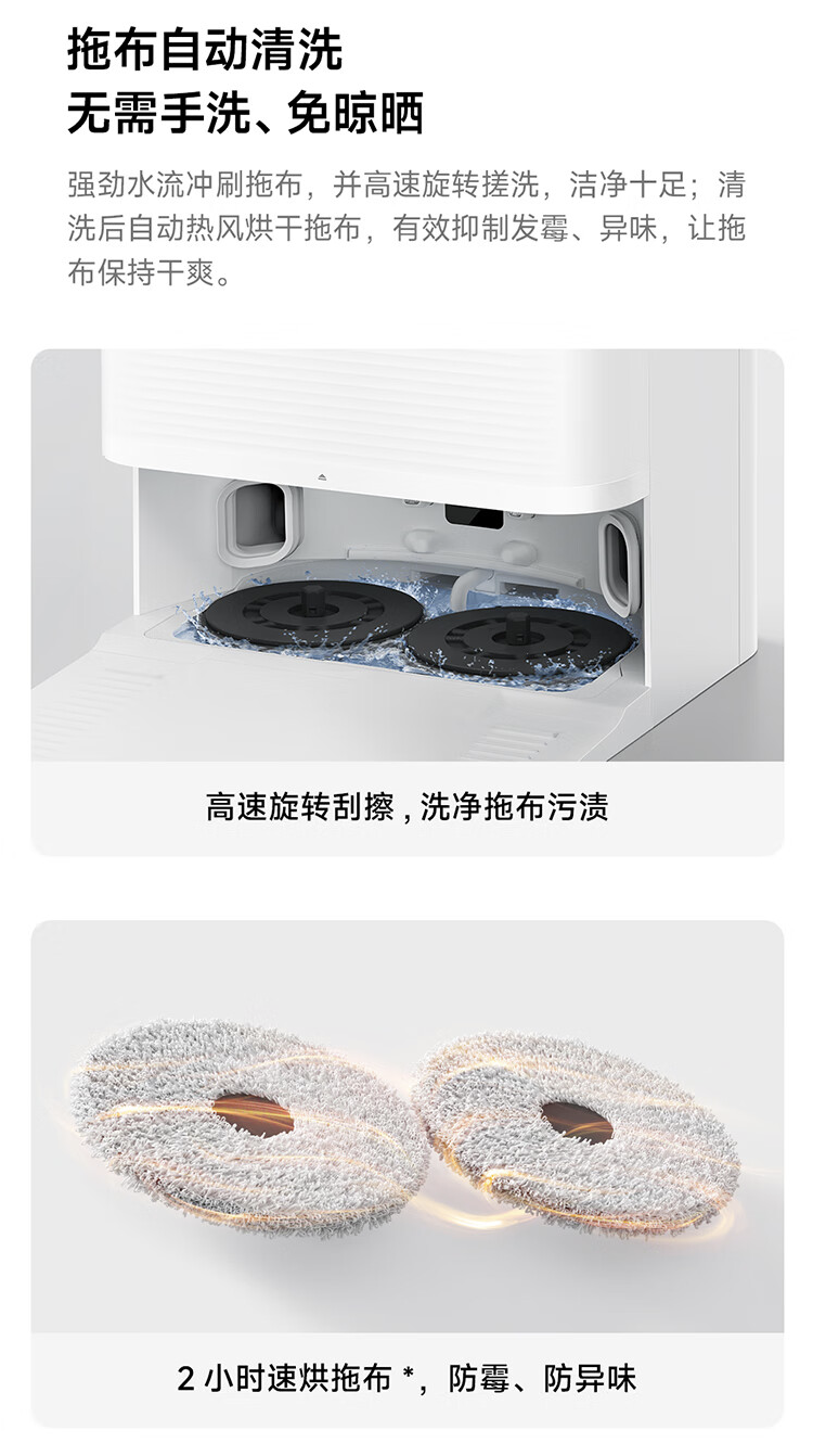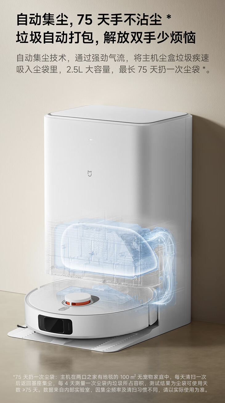 据介绍,这款扫地机器人配备“多合一自清洁基座”,支持免洗拖布,免晾晒,自集尘,号称最长 75 天扔一次尘袋,同时配备 4L 水箱,支持选配自动上下水装置。