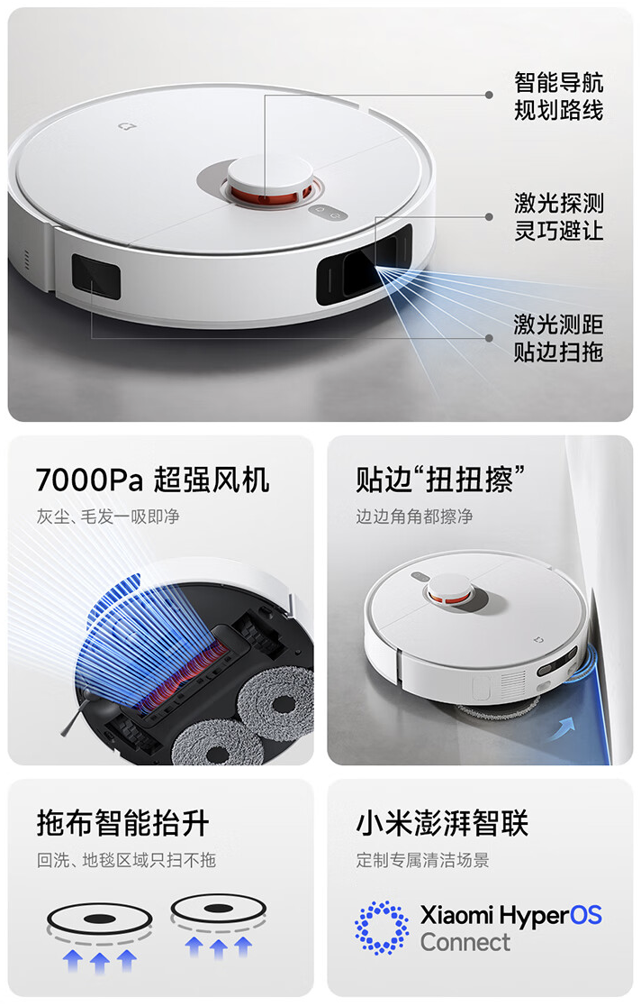 此外,这款扫地机器人拥有 7000Pa 吸力,支持扭动式贴边擦地,配备 120 度广角激光探测能力,号称能够减少边角漏扫,同时支持拖布智能升降。