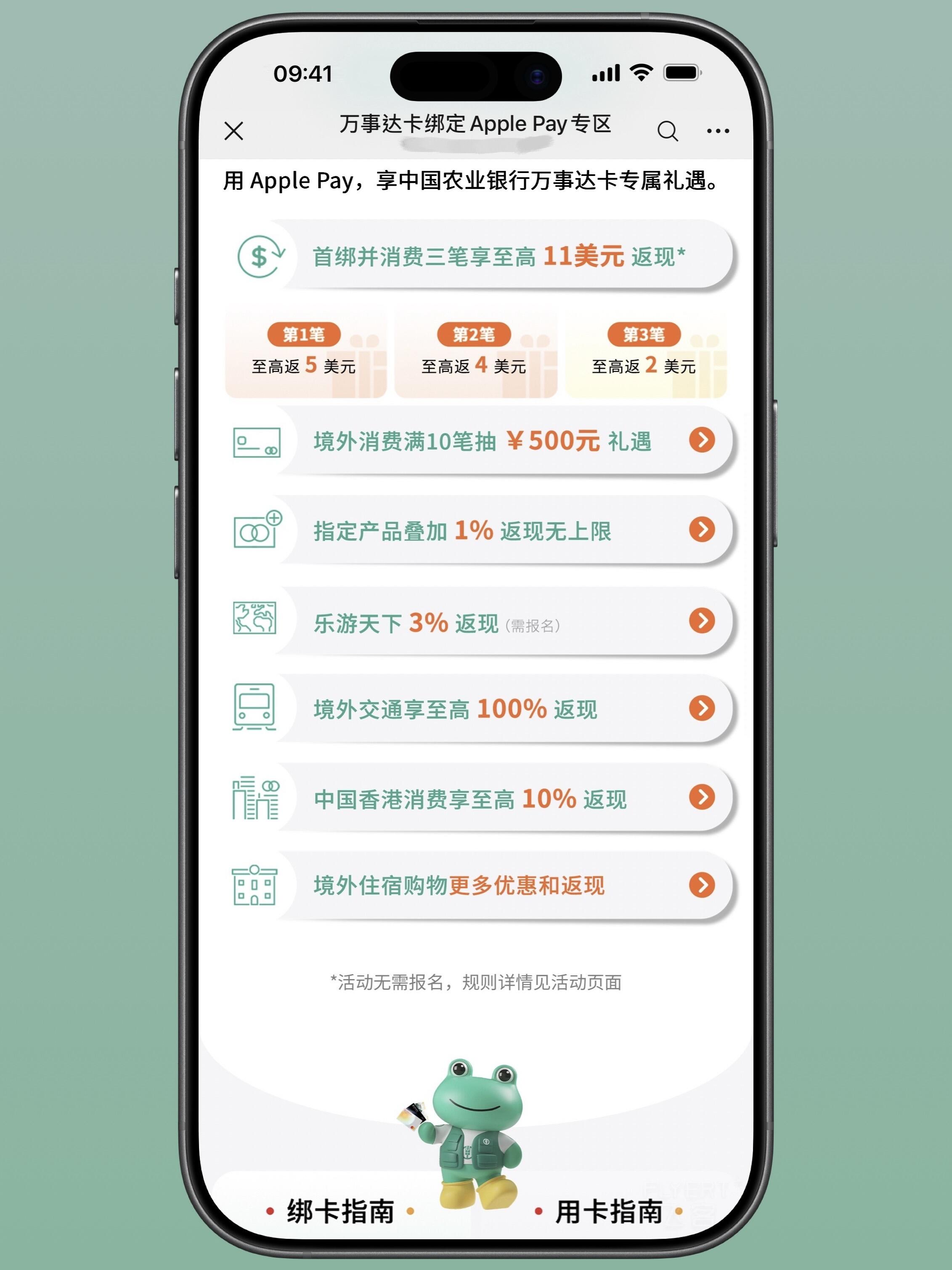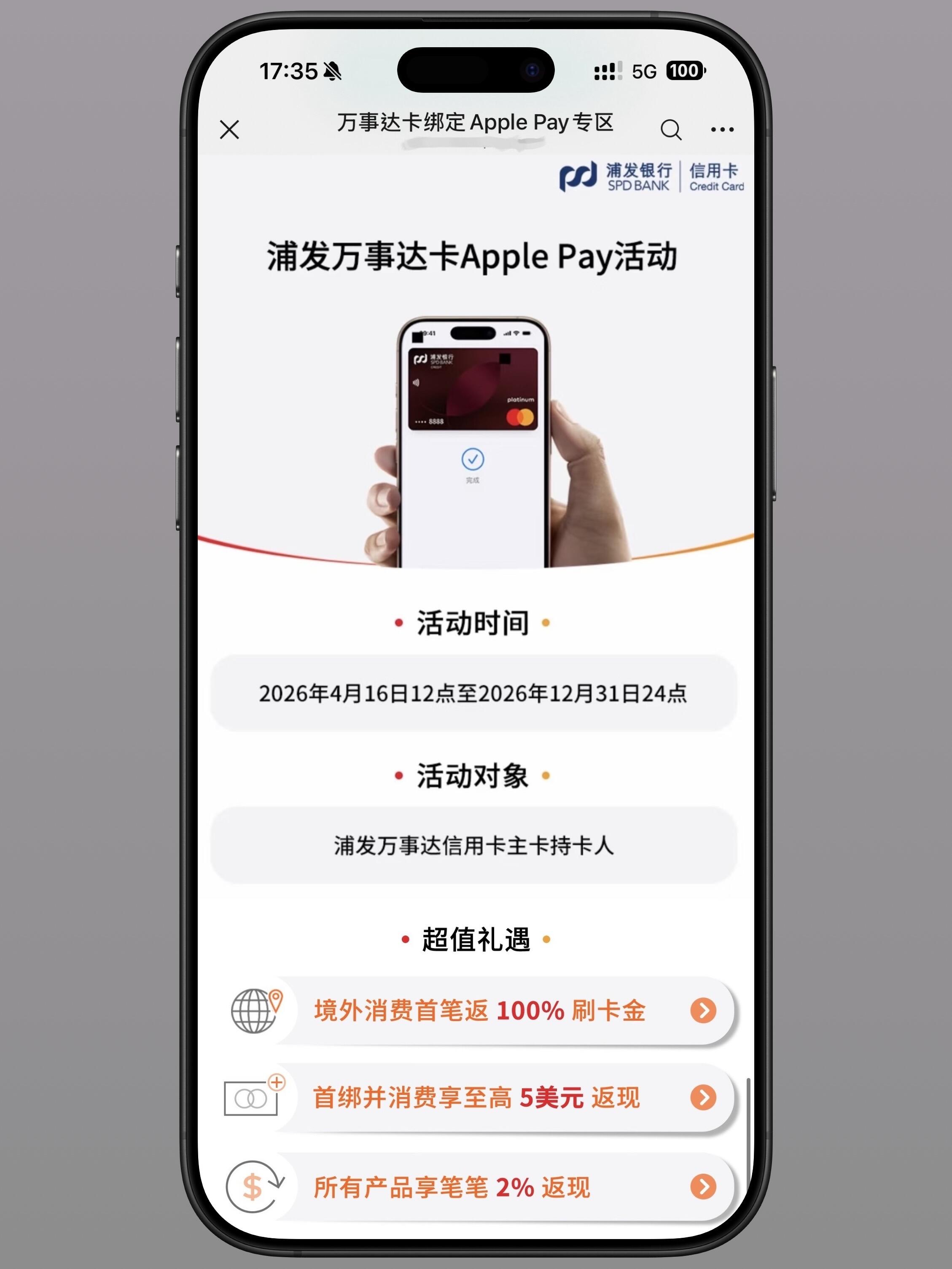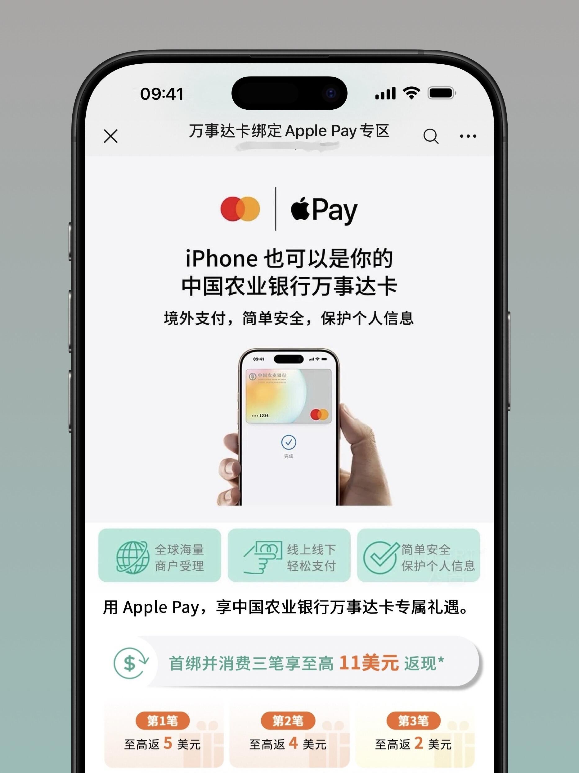 以中行为例,苹果 Apple Pay 用户在 2026 年 4 月 16 日至 2026 年 6 月 30 日绑定在中国国内(不含港澳台地区)发行的万事达标识信用卡,并在境外及中国香港、中国澳门、中国台湾地区经由万事达清算网络进行 Apple Pay 消费,即有机会获得订单金额 100% 消费金奖励,单笔消费金至高返等值 5 美元(现汇率约合 34.1 元人民币),同一信用卡活动期间限参与 3 次。活动期间奖励池每月上限 60,000 美元。