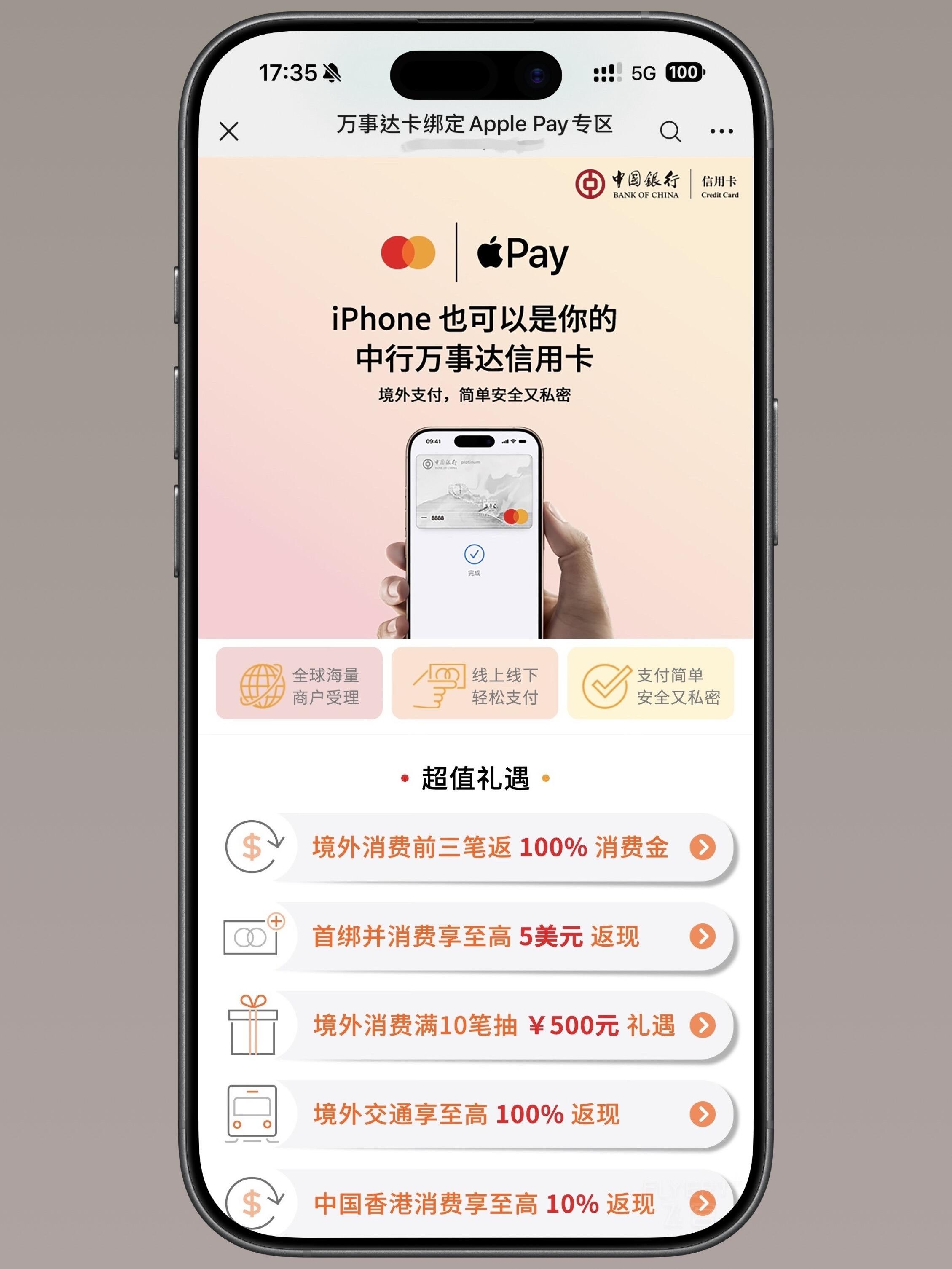 同时,中行还公布了万事达卡 Apple Pay 境外消费返消费金的活动,届时苹果用户可将其万事达信用卡添加至 Apple 钱包参与消费活动。