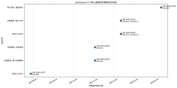 就这样一路修到了 12 月,即使是案例里没用到的第 6 个漏洞,也在今年 2 月份的 iOS 26.3 上补齐了。