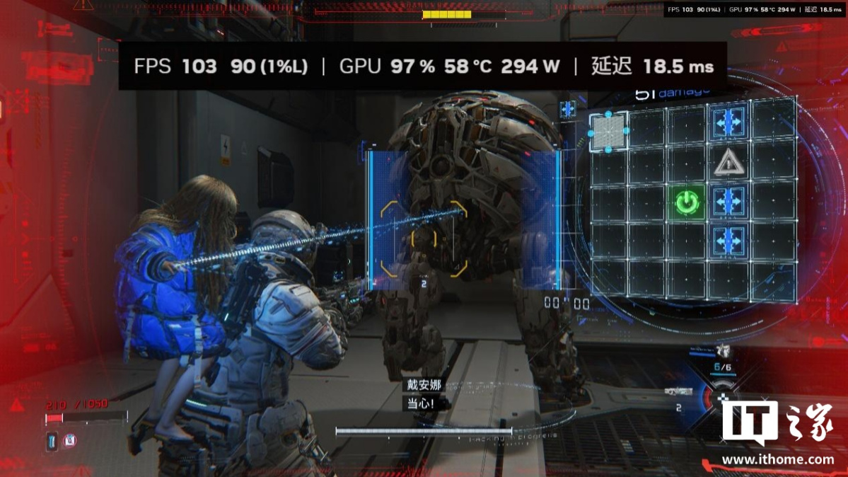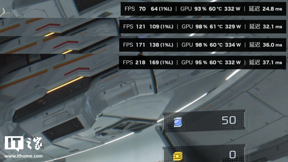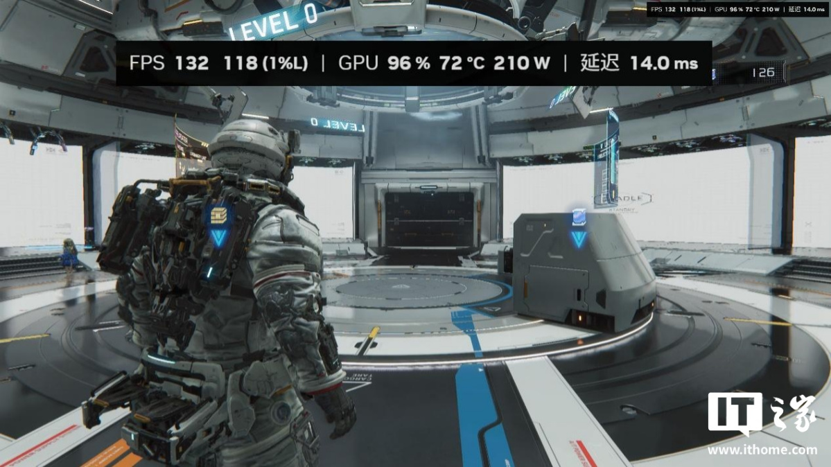 在游戏中,我们完整体验第一个地图后,发现绝大多数空间站的室内跑图场景,RTX 5080 显卡在开启路径追踪 + DLSS 性能 + DLSS 4 倍多帧生成下,游戏平均帧数都保持在 200 帧以上,1% Low 也不会低于 150 帧。只有剧情过场动画中,由于帧生成无法生效,游戏的平均帧数才会掉到 100 帧以下,因此开启多帧生成后,进入播片的前一两秒会有个明显的掉帧感。