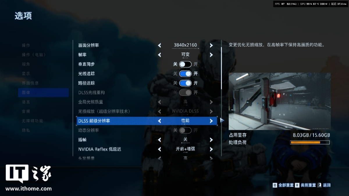好在,当我们进一步启用 DLSS 性能档时,显存占用降回到 8GB 附近,实时帧数也回升到了 87 帧左右,对 RTX 5080 而言算是舒适区。