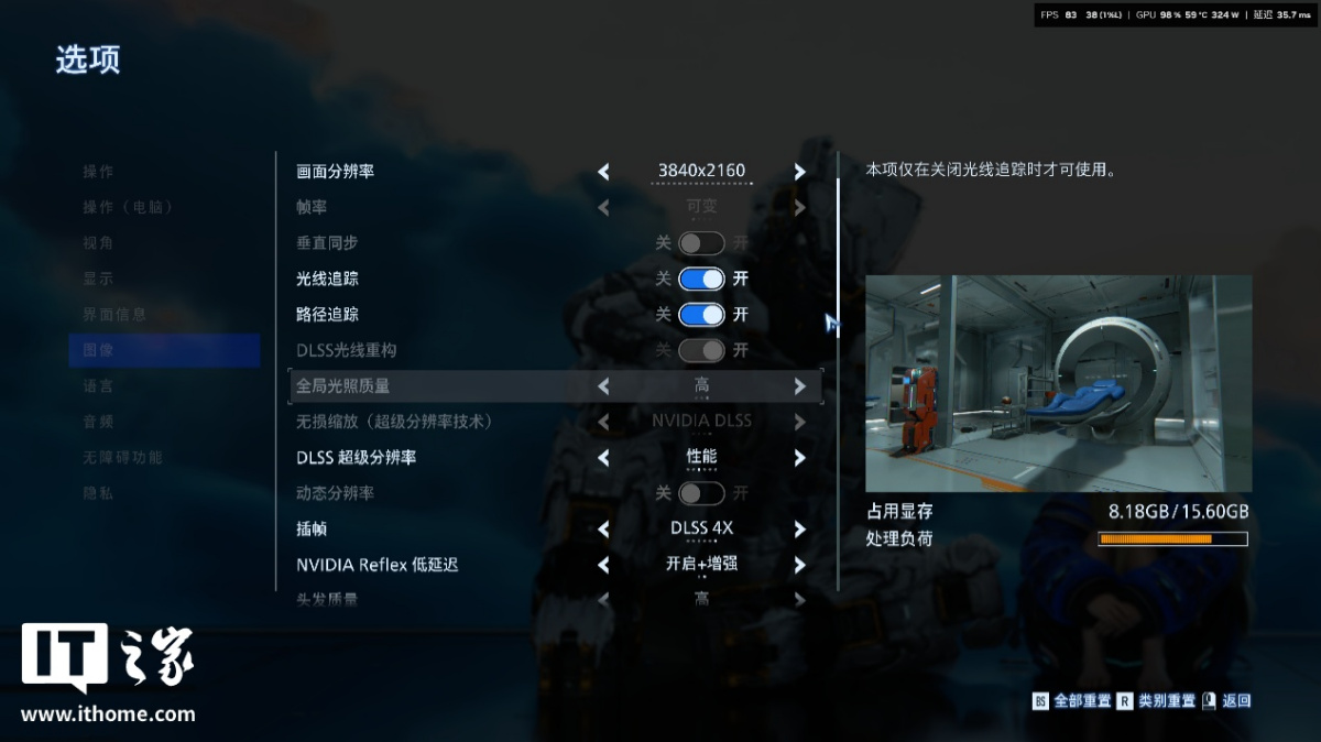 但是玩家在开启路径追踪后,性能压力瞬间暴增,显存占用虽然标注为 8.7GB,但处理负荷条已经变红,NVIDIA App 性能监测显示实际游戏帧数只有 30 帧,显然即使是 RTX 5080 显卡,在 4K 分辨率 + 高画质下,开启路径追踪的代价也是非常大的。