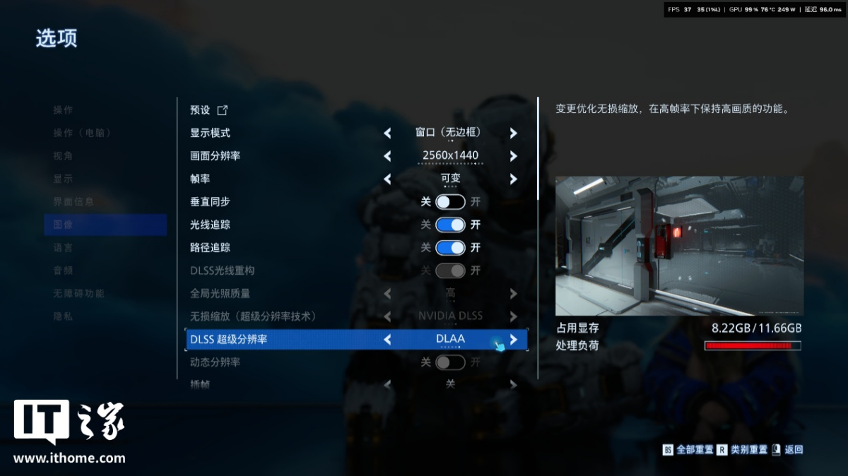 开启路径追踪,并将 DLSS 超分辨率选项切换到 DLAA 时,RTX 5070 的 12GB 显存依旧不够用,游戏实时平均帧数只有 27 帧,处理负荷条直接变成红色。