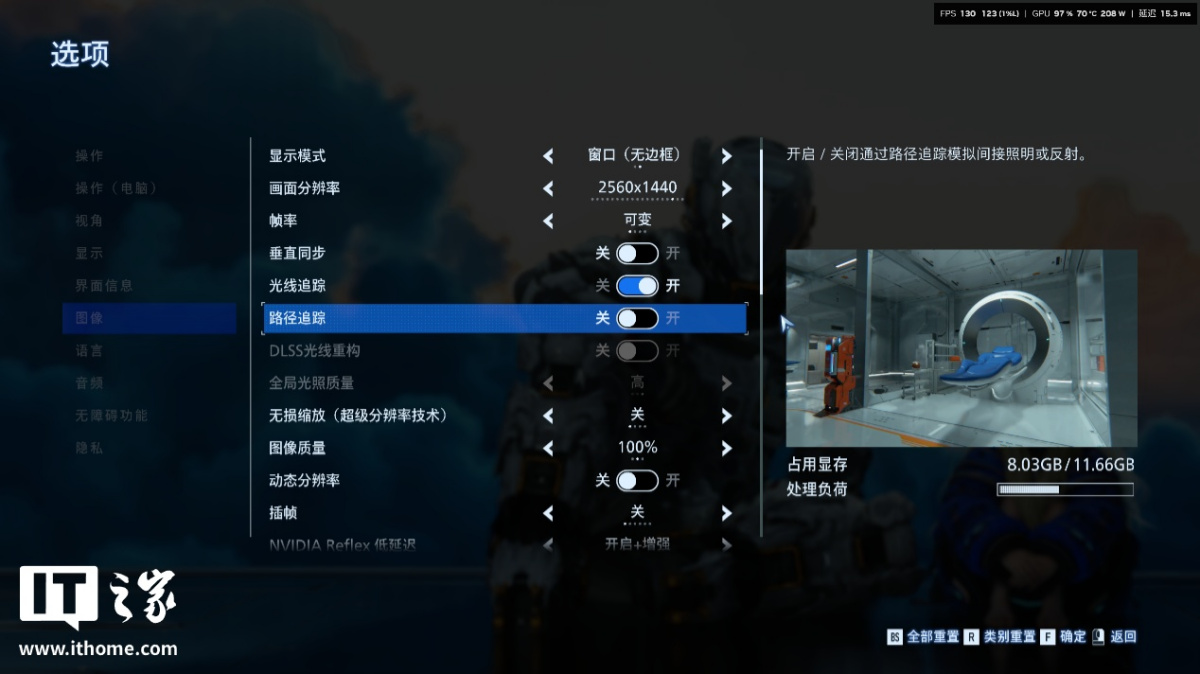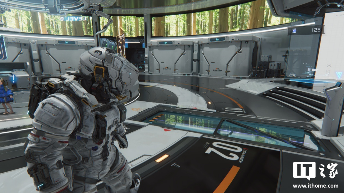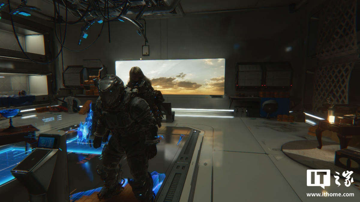 第一个测试场景,我们选择了玩家可以升级装备和自身能力等级的空间站大厅,这里整体被光线点亮,很适合测试路径追踪的表现。