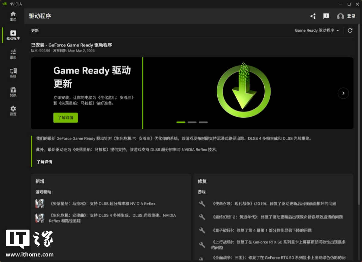 GeForce Game Ready 驱动程序更新到了 595.99 版本,游戏的性能数据也会基于 NVIDIA App 的信息浮窗功能采集。