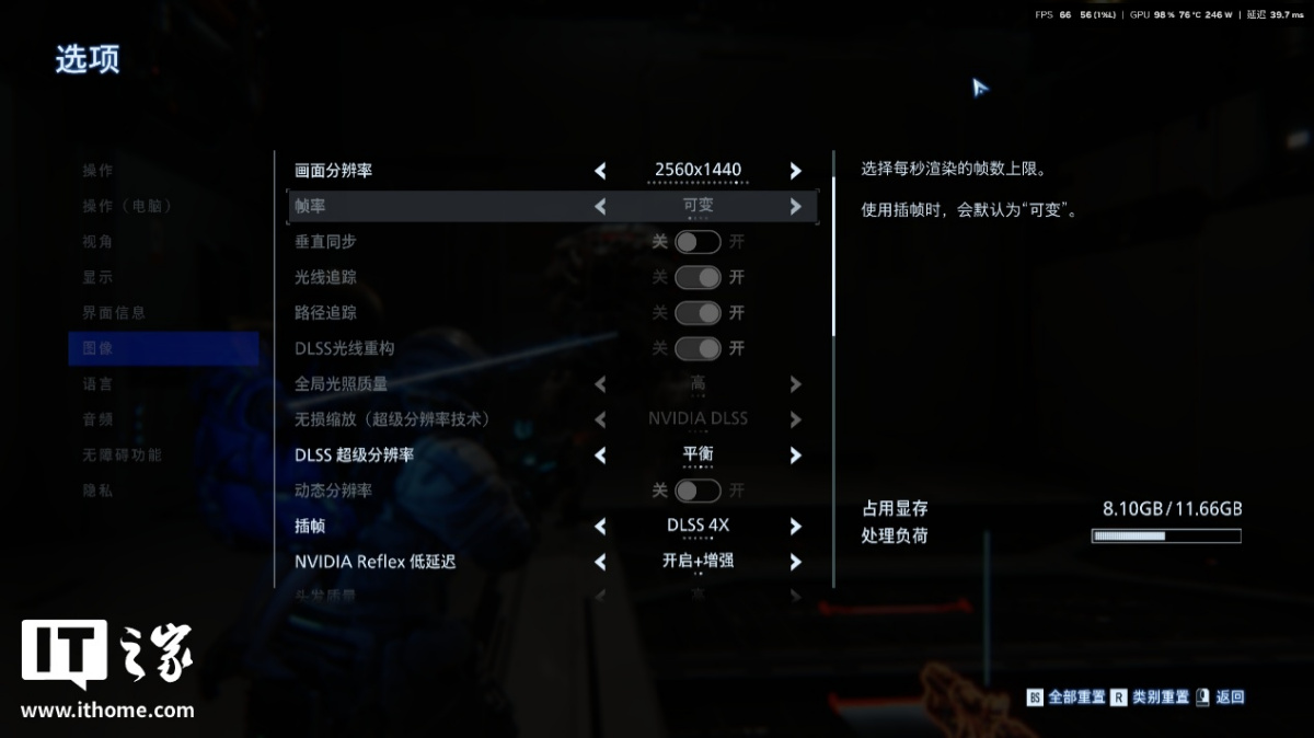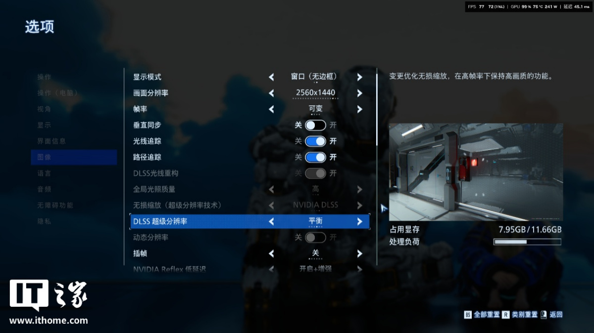 接着打开 DLSS 平衡档位后,显存占用下降到 7.9GB,处理负荷条降回白色安全区。看来想要体验路径追踪,就离不开 RTX 50 系独占的 DLSS 4 多帧生成技术。