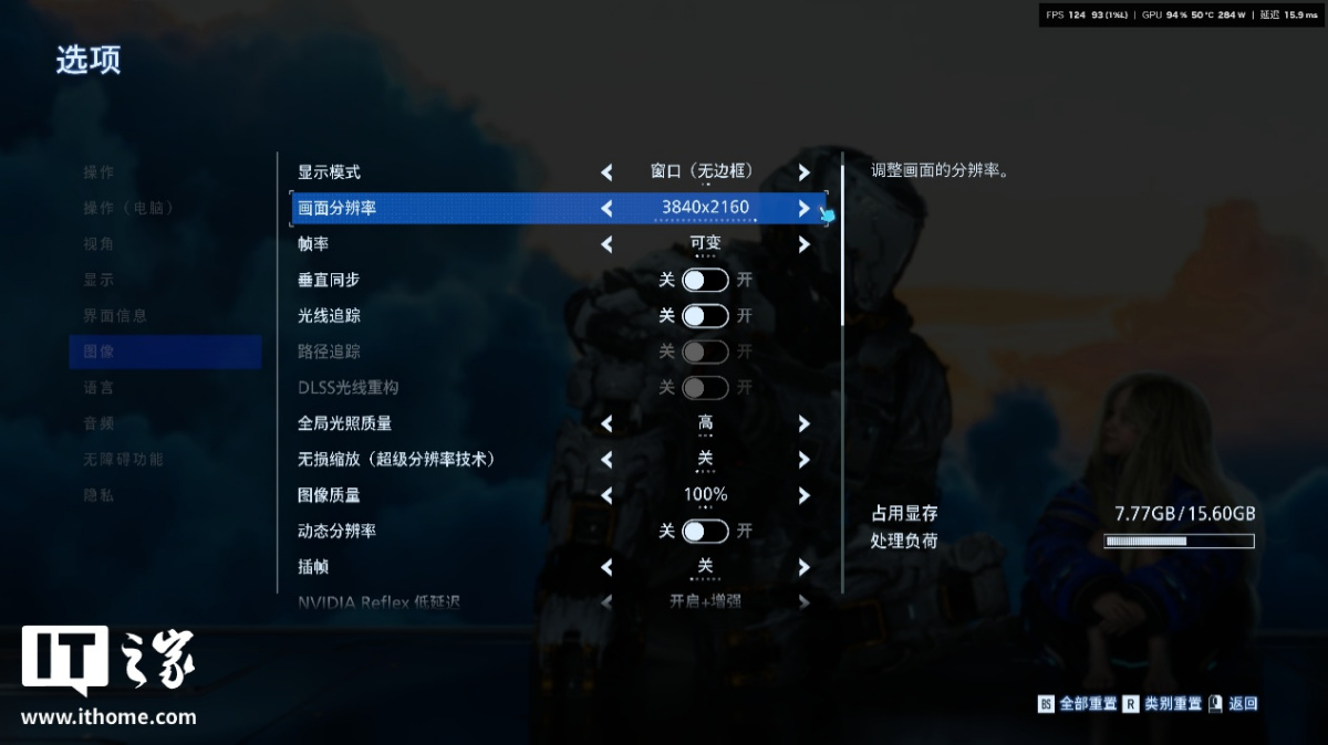 在显存占用上,关闭和开启光线追踪时,系统预估的显存占用分别为 7.7GB 和 8.5GB 左右,对 RTX 5080 来说问题不大。