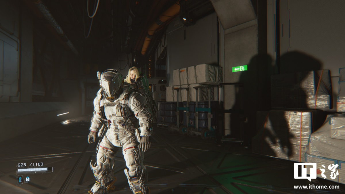 第三个场景我们选择了空间站中的货物通道,主角左侧是一块强光源的显示屏,不仅将主角宇航服左半边和右侧靠墙摆放的货物整体照亮,还将人物的影子投射在了墙上。