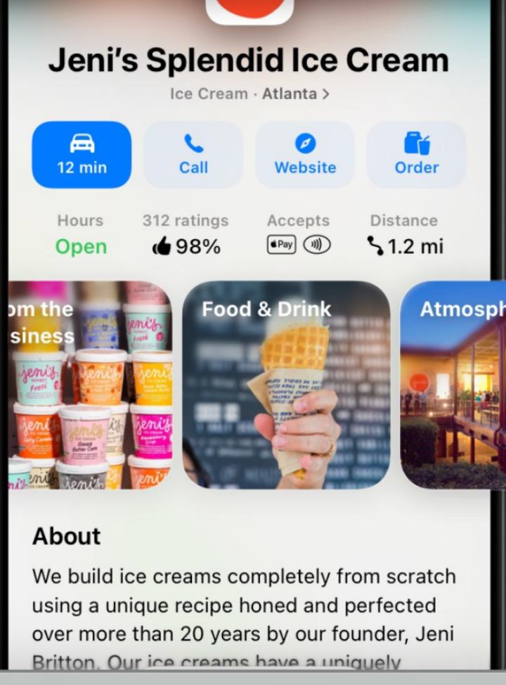 Apple Business平台整合了此前 Apple Connect 中的相关功能,聚焦品牌广告曝光,在Apple地图、邮件、钱包等iOS原生应用提供广告位,支持企业自定义品牌档案、门店展示形式,如地图商家信息卡、封面照片等等。用户点击卡片可直接查看门店详情、获取导航路线,助力线下门店引流。