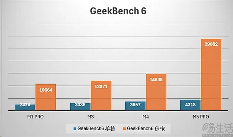 从我们的实测成绩来看,与此前测过的几代搭载M系列芯片的机型相比,M5 Pro的超级核因为解码宽度相比以往的大核没有变化,因此单核性能反而进步不是特别巨大。但很明显,更多的核心数量加上更大规模的“性能核”,使得它的多核表现远超一般的“大小核”处理器。