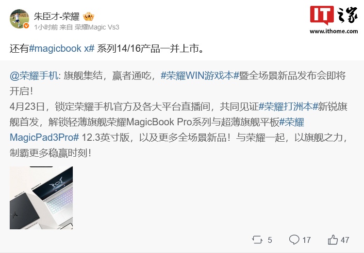 IT之家 4 月 17 日消息,荣耀终端股份有限公司 PC 产品总经理朱臣才今日中午表示,2026 款 MagicBook X14 / X16 笔记本电脑将在 4 月 23 日与荣耀 WIN 游戏本 H9 / H7 等一道上市。
