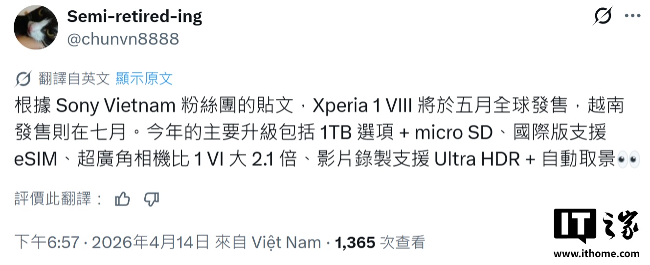 IT之家 4 月 17 日消息,消息人士 @chunvn8888 本周二(4 月 14 日)在 X 平台发文称,据索尼越南 Facebook 粉丝团爆料,索尼 Xperia 1 VIII 手机全球版将在今年 5 月发布,越南版则是 7 月发售。