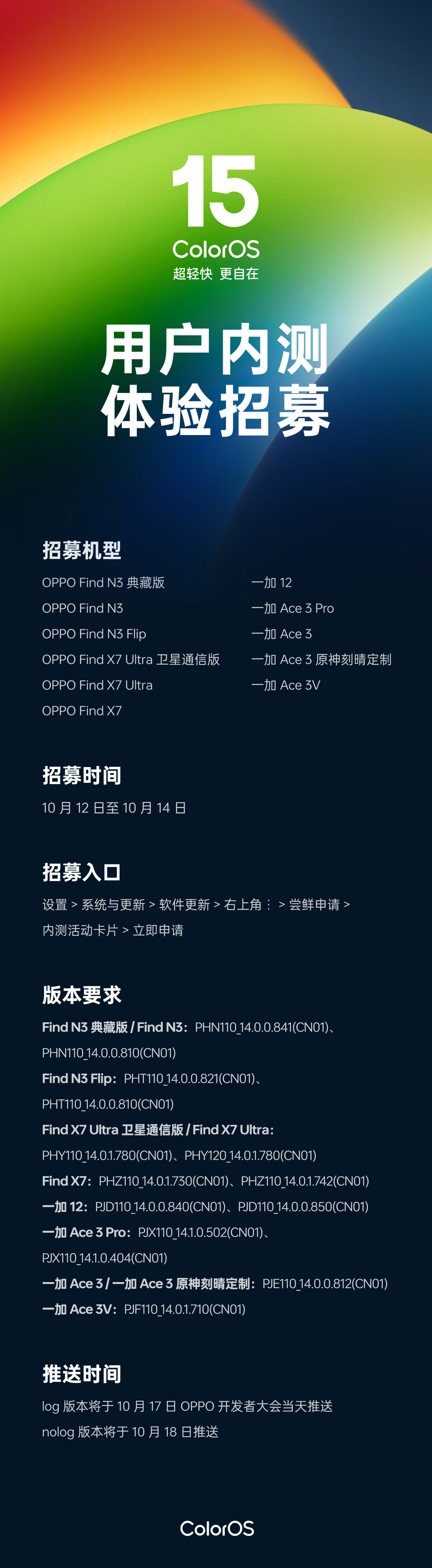 IT之家此前报道,OPPO 2024 开发者大会将于 10 月 17 日举行,届时将带来全新 ColorOS 15。目前 OPPO Find N3、Find X7、一加 12 等机型已开启新系统内测招募,将在发布会当天开启推送。