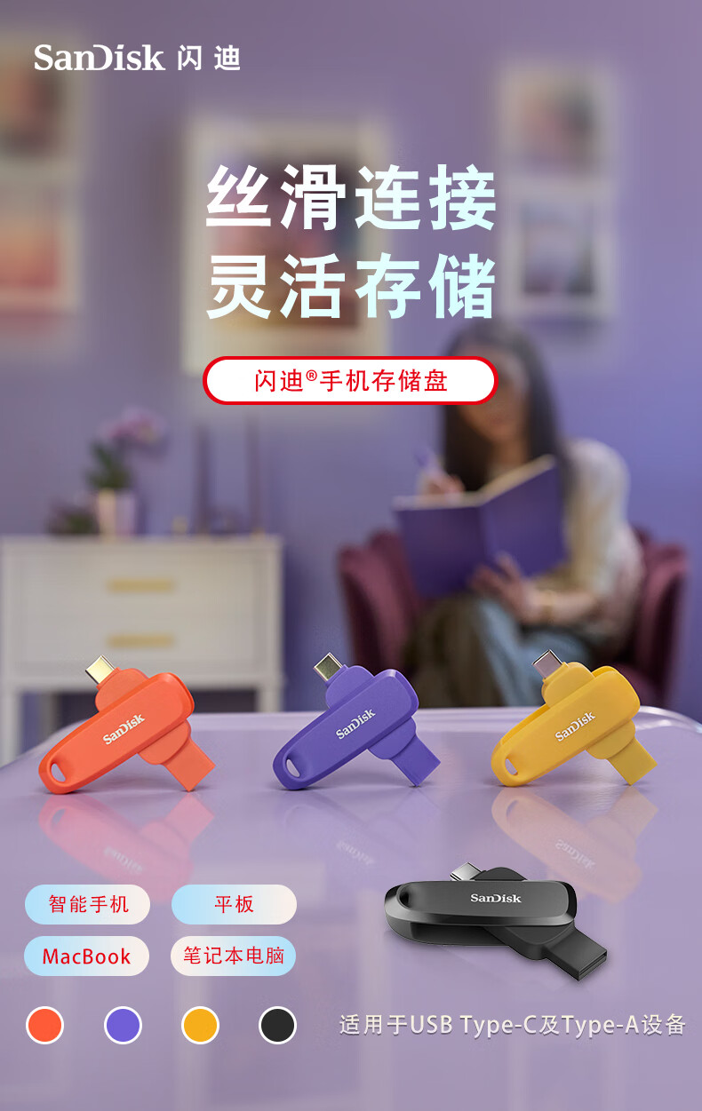 其中 USB Type-C + USB Type-A 接口的 DDC6 系列容量覆盖 32GB~512GB,提供静谧黑、魔力橙、典雅黄、神秘紫四种配色,读取速度最高可达 100MB/s,具备 5 年有限质保。