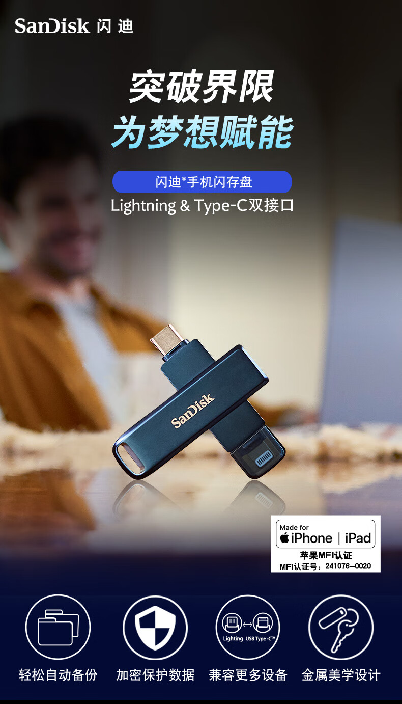 而 USB Type-C + Lightning 接口的 IDX0N 系列容量覆盖 64 / 128 / 256 GB,仅有宝石蓝一种配色,读取速度最高可达 90MB/s,具备 2 年有限质保。