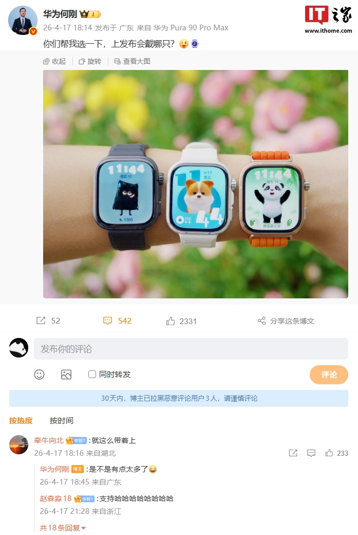 IT之家 4 月 19 日消息,华为终端 BG 首席执行官何刚在微博晒出了新款手表的正面外观,并向网友询问上发布会戴哪只更好。