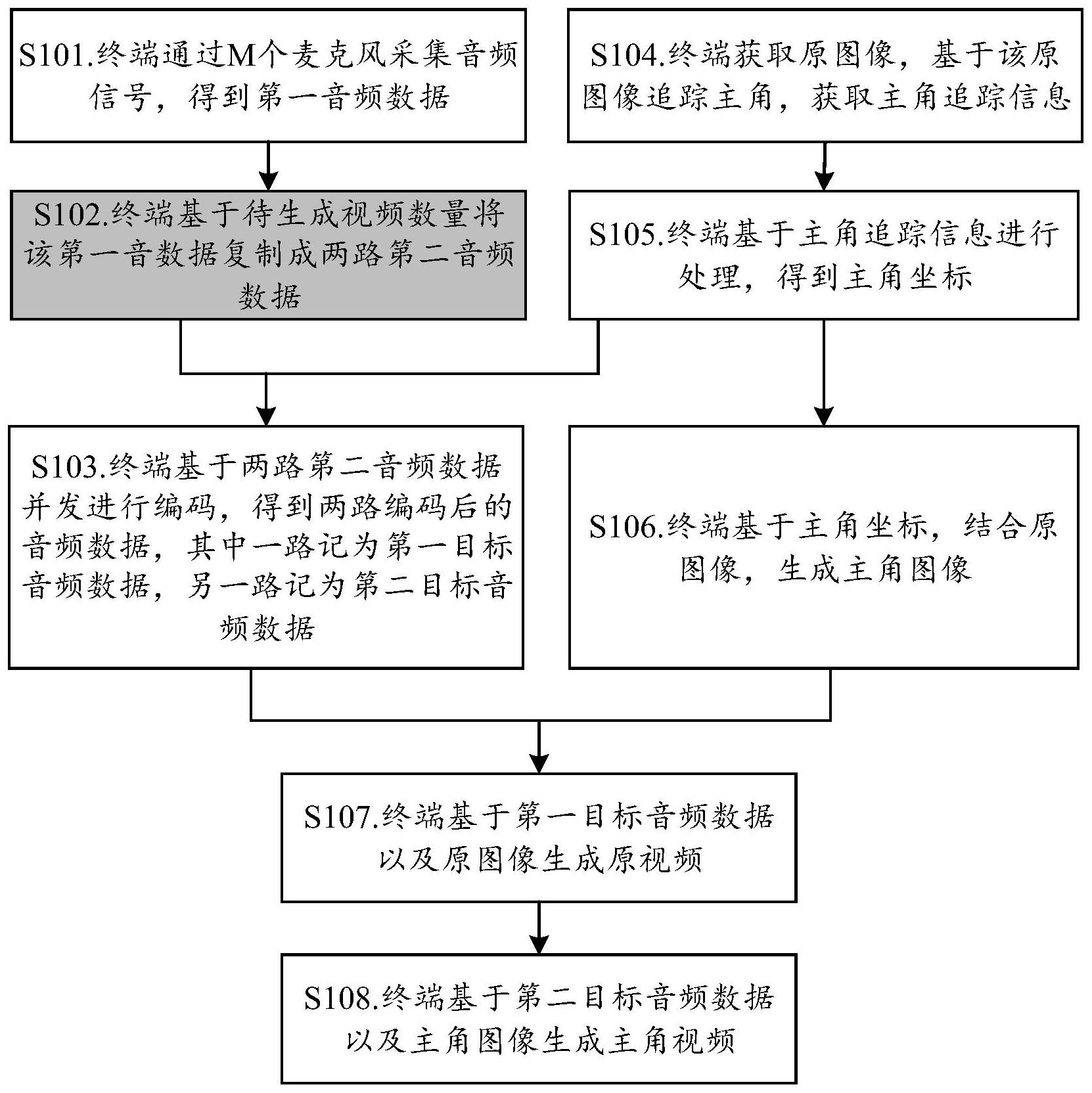 一种视频处理方法和终端。实施本申请提供的技术方案,终端在确定录制主角之后,可以同时生成两个视频,其中一个为主角视频,另外一个为原视频。为了实时的得到两个视频(原视频以及主角视频),则需要对第一音频数据进行复制,得到两路第二音频数据,对该两路第二音频数据并发的进行编码以实时生成这两个视频。