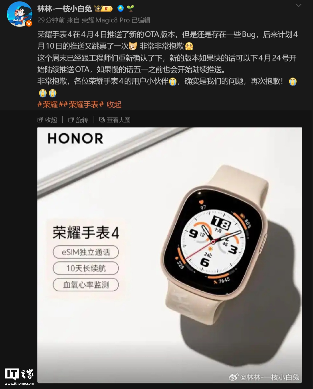 IT之家 4 月 19 日消息,荣耀中国区智慧生活业务部部长林林今天在微博表示,荣耀手表 4 最快下周五(4 月 24 日)开始陆续 OTA。