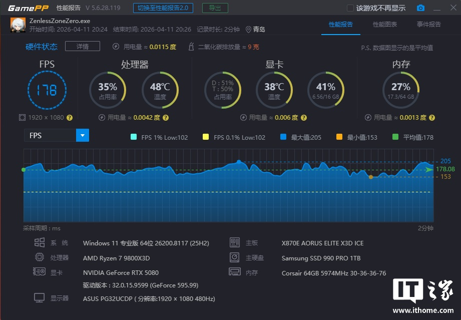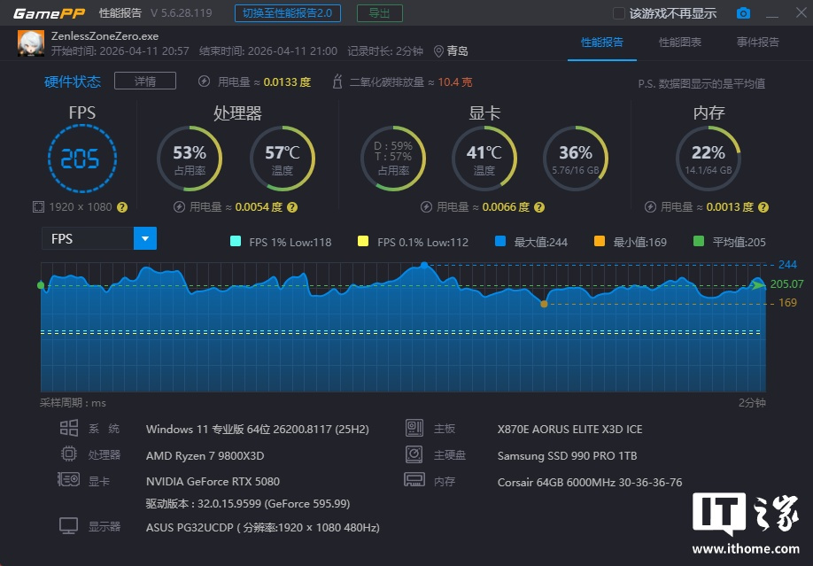锐龙 7 9800X3D 在「极限游戏」模式下游戏平均帧数为 205 帧,1% Low 为 118 帧;