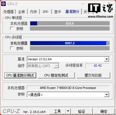 锐龙 7 9800X3D 在「标准」模式下单线程得分 835 分,多线程得分 8983 分;