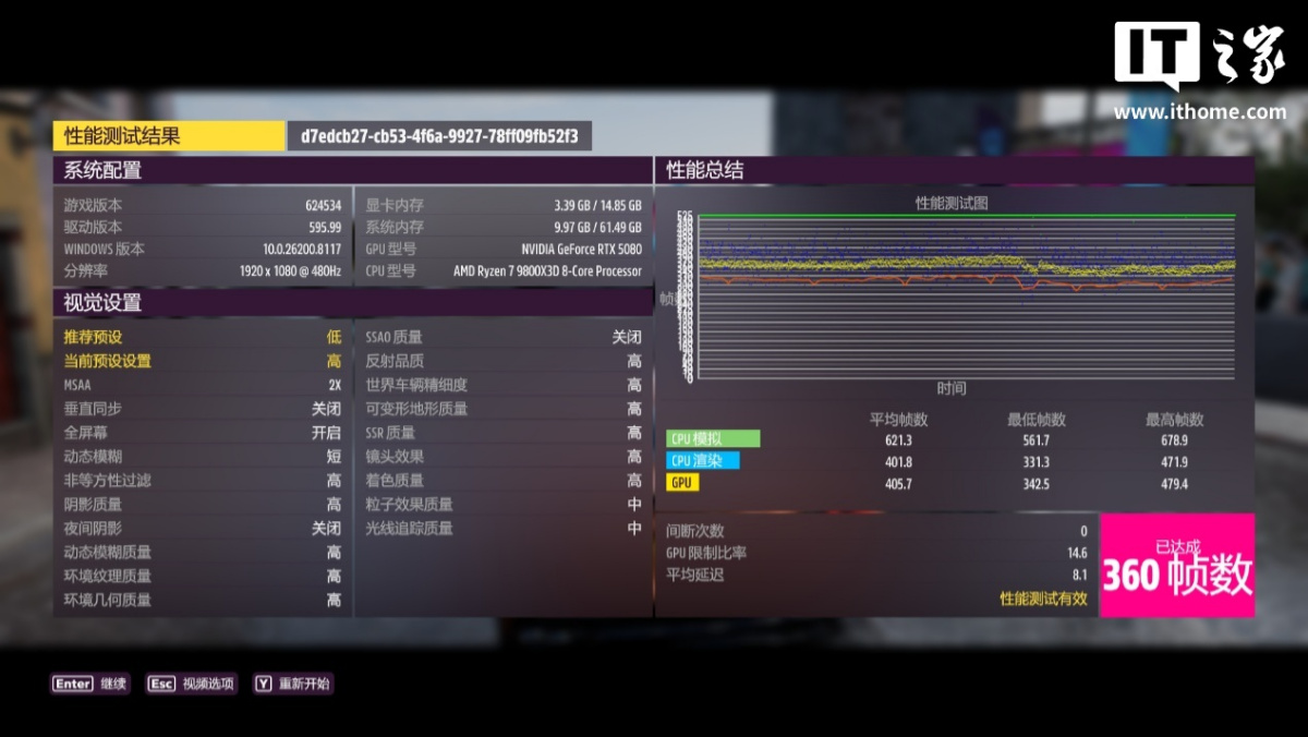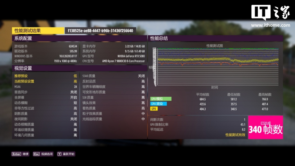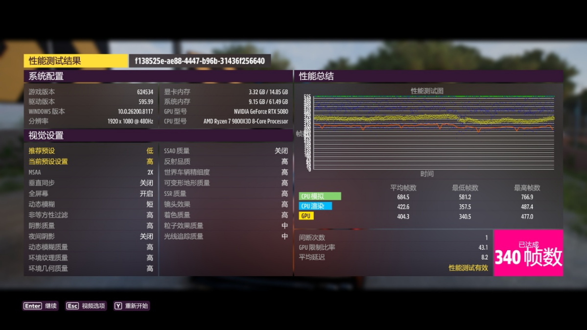 第五款游戏是《极限竞速:地平线 5》,以 1080P 分辨率 + 高画质 + MSAA 2x 抗锯齿预设,运行自带基准测试:
