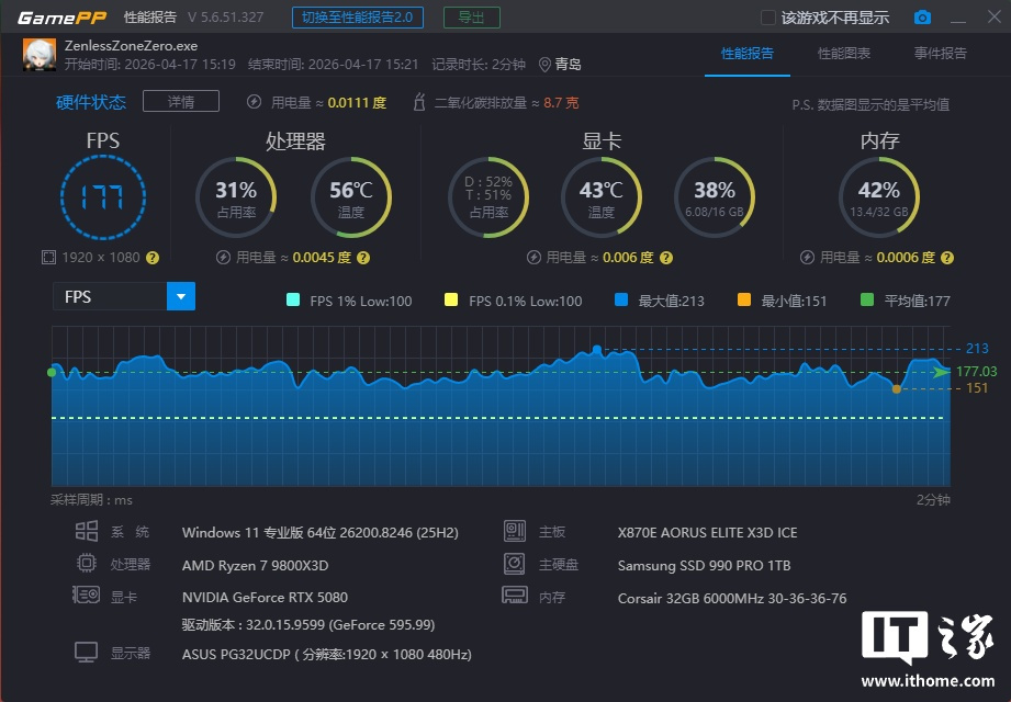 单 32GB DDR5 内存在「标准」模式下游戏平均帧数为 177 帧,1% Low 为 100 帧;