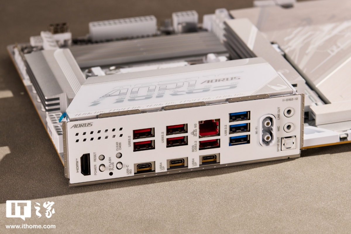CPU 右侧搭载 4 条 DDR5 内存插槽,支持最高 9000+MT/s 内存频率和 256GB 容量扩展。主板扩展性上,所有内存插槽、PCIe 插槽、M.2 插槽区域和可拆卸散热装甲部分均做了快易拆设计,PCIe 插槽表面也做了铝合金加固处理。它的板载扩展包括: