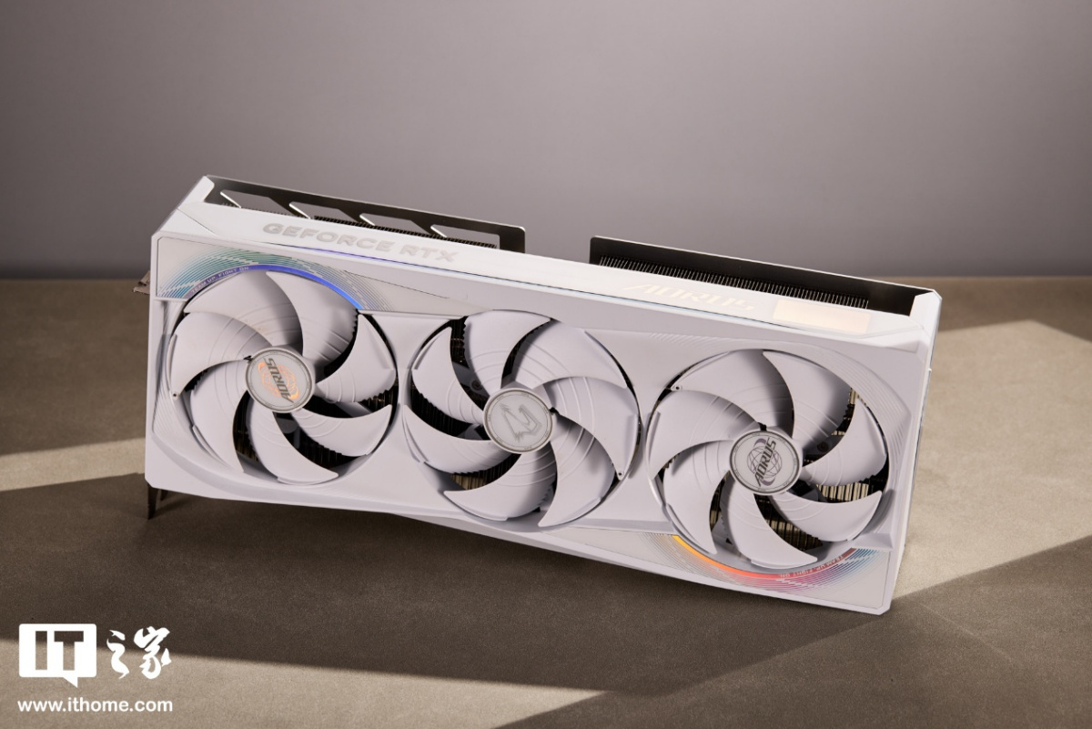 显卡方面,这次我们也配备了同样是纯白配色的技嘉 RTX 5080 超级雕 ICE 显卡,正面 3 把 113mm 直径的 7 扇叶仿生风扇,两正一反的扇叶方向设计可有效减少相邻风扇之间的扰流并提升风压,支持智能启停。