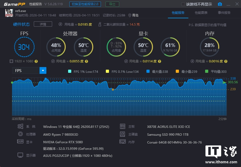 锐龙 7 9800X3D 在「标准」模式下游戏平均帧数为 304 帧,1% Low 为 174 帧;