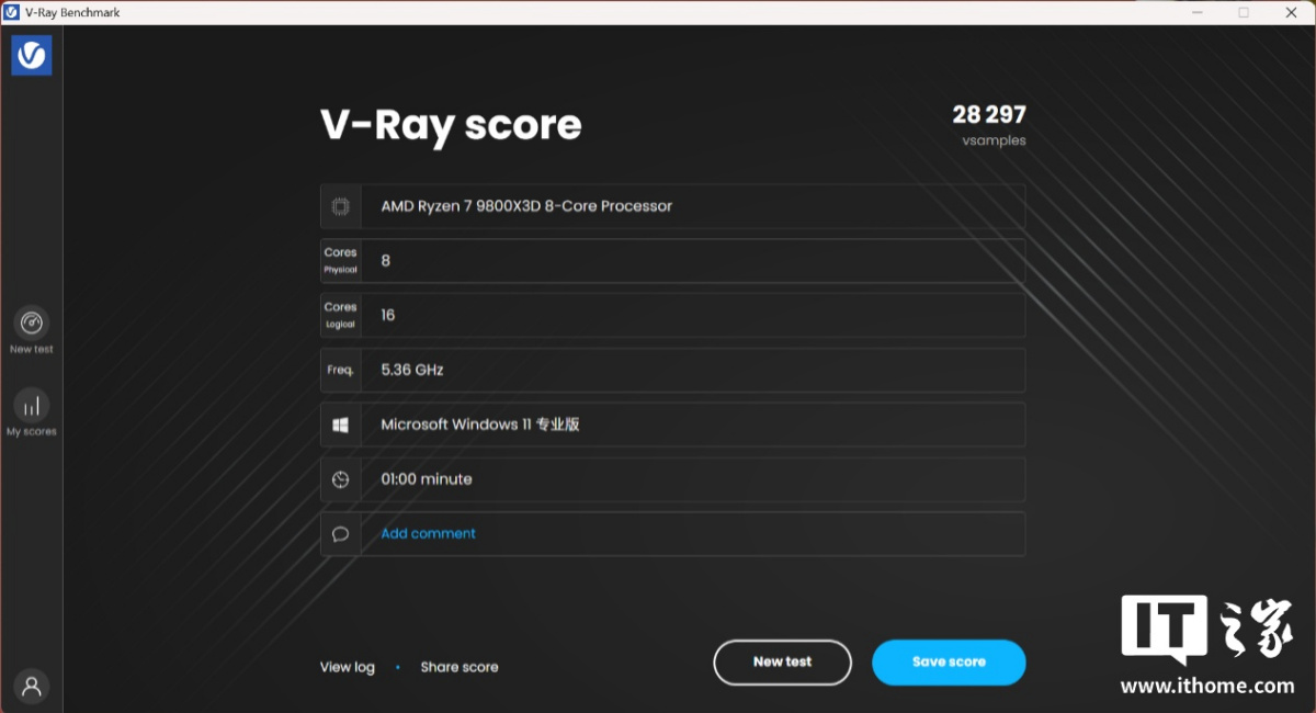 锐龙 7 9800X3D 在「标准」模式下 CPU 综合得分 28297 分;
