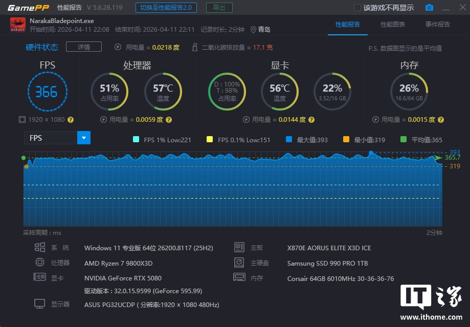 锐龙 7 9800X3D 在「极限游戏」模式下游戏平均帧数为 366 帧,1% Low 为 221 帧;