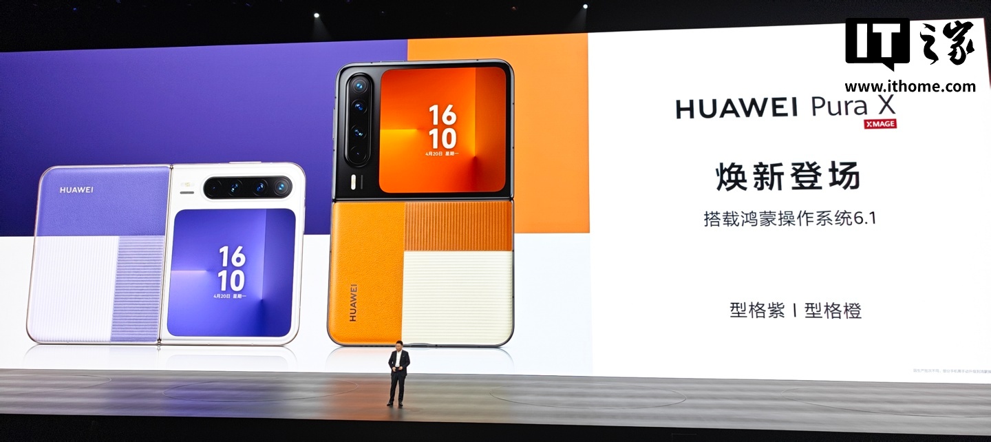 IT之家从发布会现场了解到,Pura X 现在推出了“型格紫”“型格橙”两个新配色,16GB+512GB 版本售价 7999 元,搭载鸿蒙操作系统 6.1。