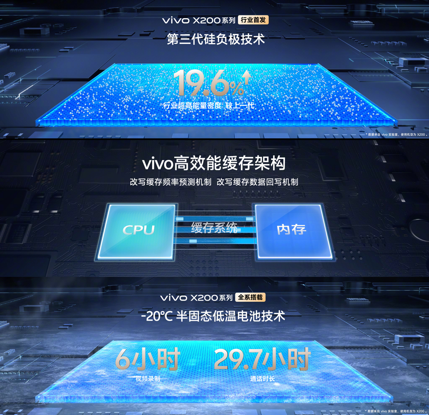 据介绍,vivo X200 系列手机行业首发第三代硅负极技术,能量密度较上代提升 19.6%;基于用户高清视频、导航等重载场景,改写 SoC 内部运作机制,手机更省电。