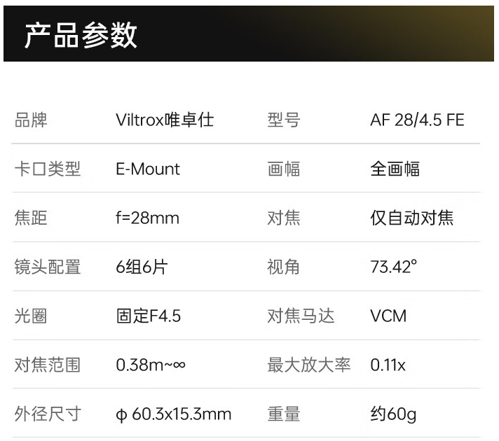 IT之家 10 月 14 日消息,唯卓仕 28mm F4.5 全画幅饼干镜头现已正式现货开售,这款镜头提供索尼 E 卡口,首发价 439 元。