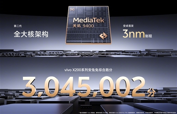 根据发布会上公布的数据,vivo X200系列的安兔兔综合跑分达到了史无前例的3045002分,这也是首款跑分突破300万的手机,成为手机性能新标杆。