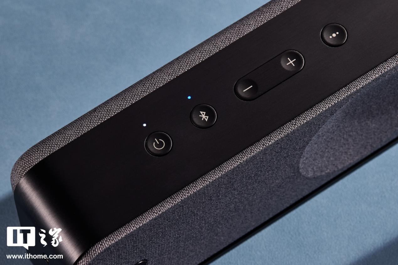 扬声器的顶部有电源、蓝牙、音量加减和多功能按钮,除了音量键是药丸形状,其他都是大小统一的圆形,一字排开,很有秩序感。在电源键和蓝牙按钮上方还有呼吸指示灯,以便于更好地交互。