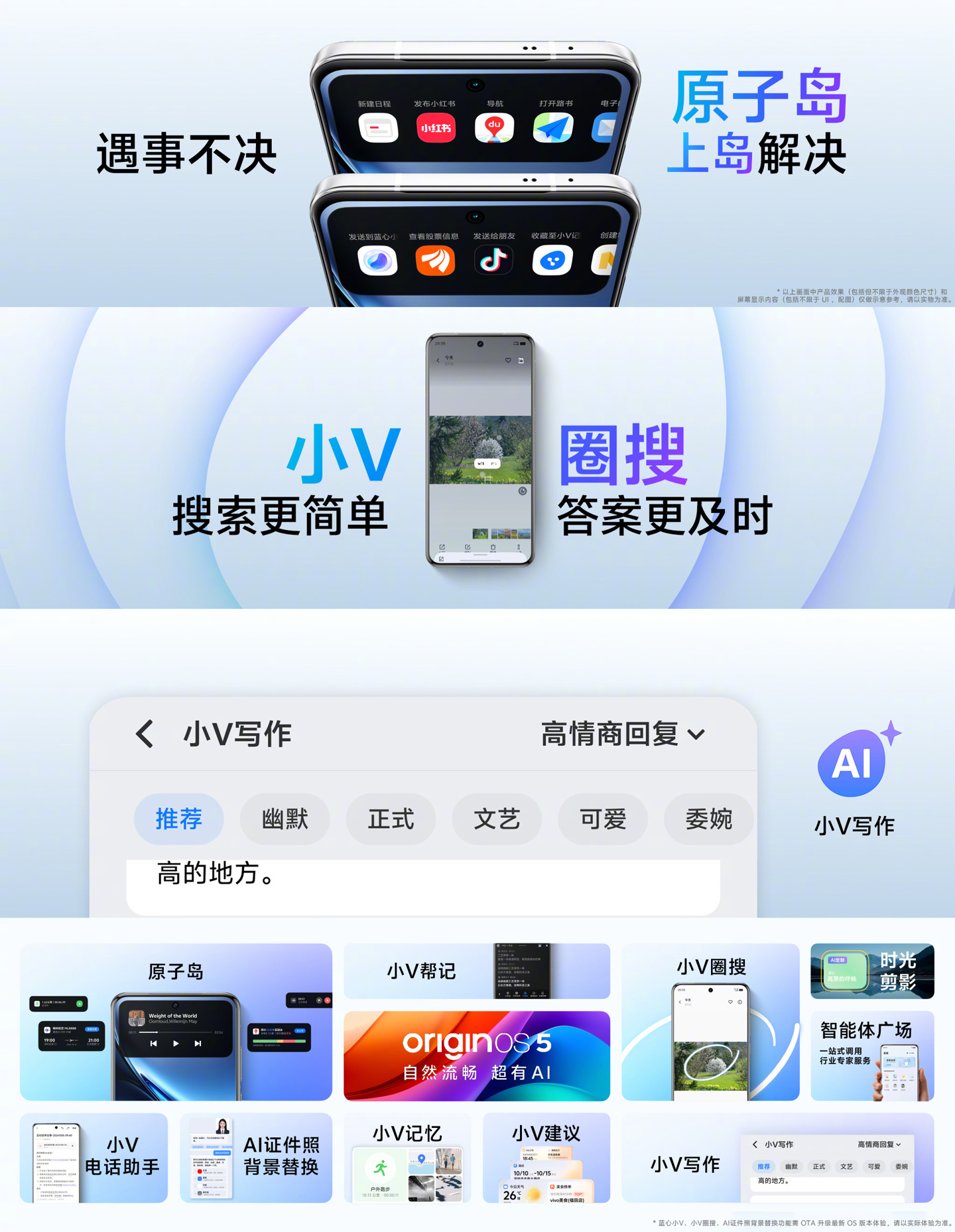 vivo X200 系列搭载全新系统 OriginOS 5,两个应用的动画独立且完整,不跳帧、不丢帧。此外,新机还支持原子岛、小 V 圈搜、小 V 写作功能。