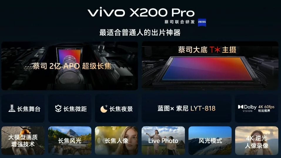 vivo X200 搭载 5000 万像素 IMX882 蔡司超级长焦,拥有蔡司 T * 镀膜、f/2.57 大光圈,搭载全新大模型画质增强技术,10X 以上高倍率更清晰。Live Photo 支持分享到小红书等平台,还有全新动态水印功能。