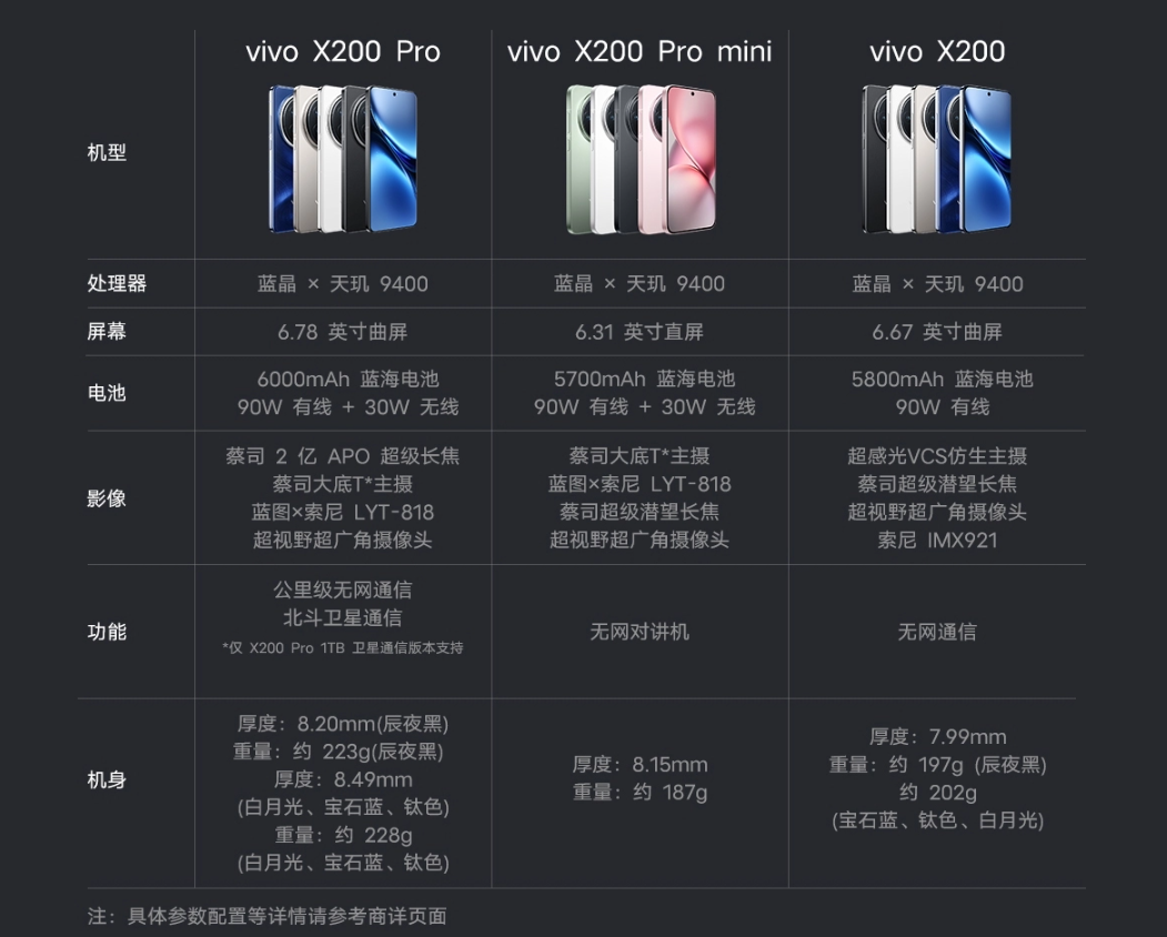vivo X200 全系列首发蓝晶 × 天玑 9400,第二代全大核架构,安卓首发 3nm 制程。X200 Pro 跑分高达 304 万,安兔兔史上首部突破 300 万跑分的手机。X200 在薄至 7.99mm 的机身装下了 5800mAh 蓝海电池,Pro 版为 6000mAh 蓝海电池。