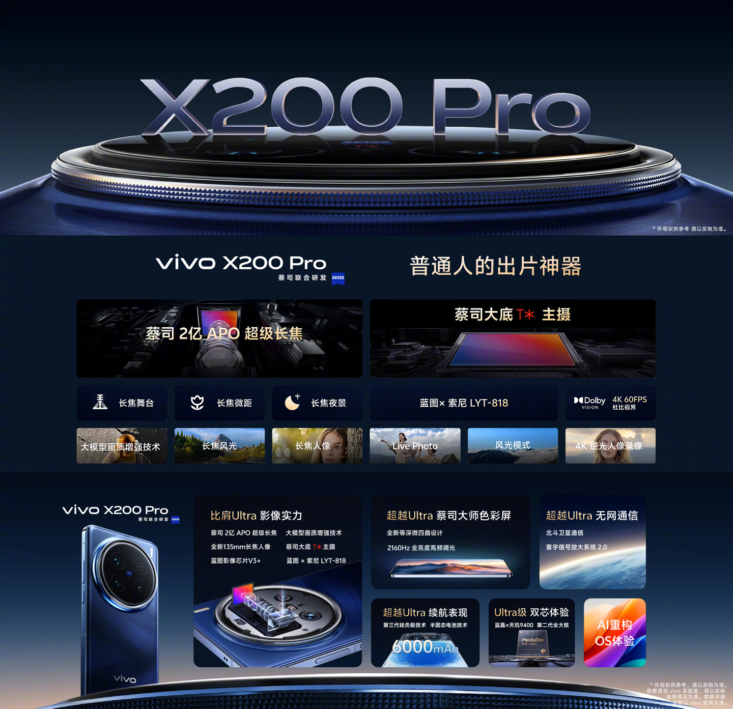 影像方面,vivo X200 Pro 手机使用蓝图 x 索尼 LYT-818 传感器主摄、蔡司 2 亿 APO 超级长焦,蓝图影像芯片 V3+;内置 6000mAh 蓝海电池;配备全等深微四曲设计的蔡司大师色彩屏,支持全亮度高频 PWM 调光。