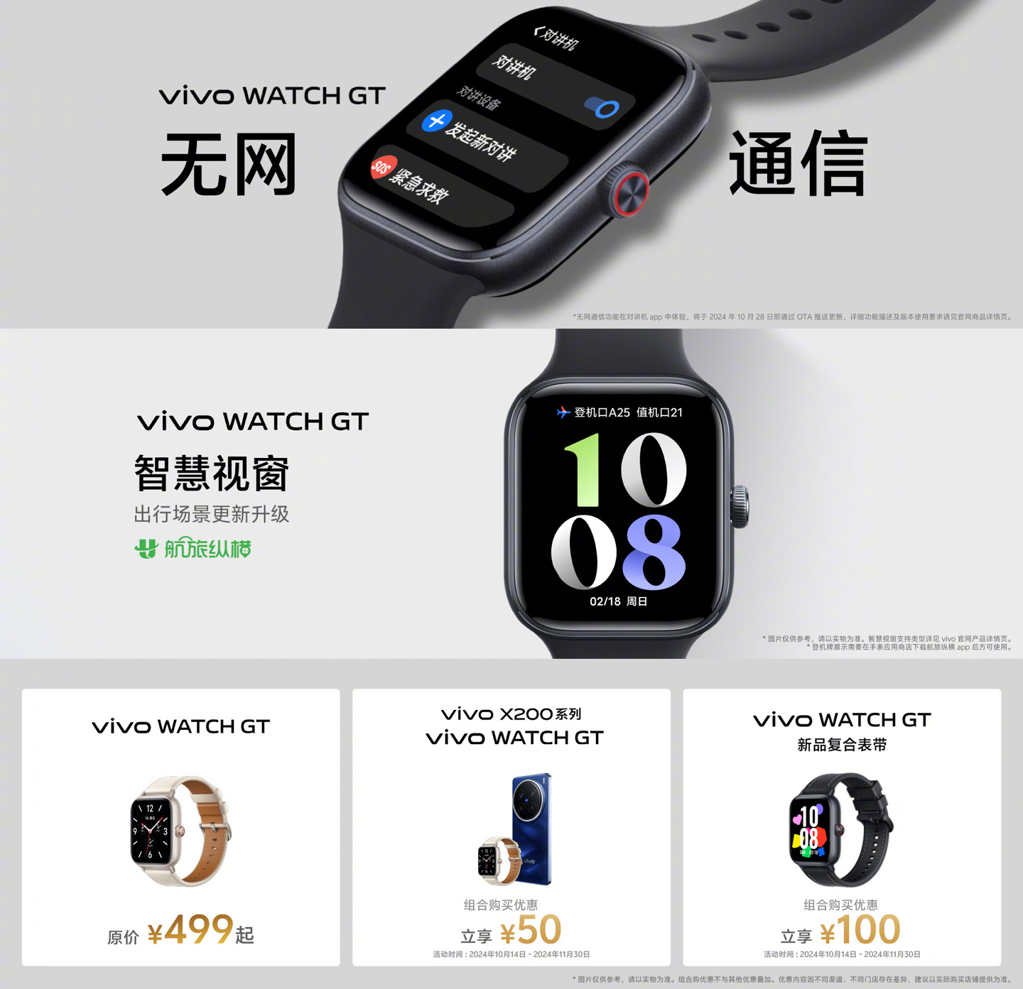 据介绍,vivo WATCH GT 原价 499 元起,搭配 vivo X200 系列购买优惠 50 元,搭配新品复合表带购买优惠 100 元,活动时间为 2024 年 10 月 14 日-11 月 30 日。
