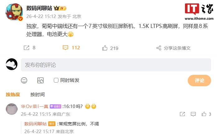 IT之家 4 月 22 日消息,博主 @数码闲聊站 今日再度爆料,称华为中端线还有一个 7 英寸级别巨屏新机,配备 1.5K LTPS 高刷屏、搭载麒麟 8 系处理器,电池更大。
