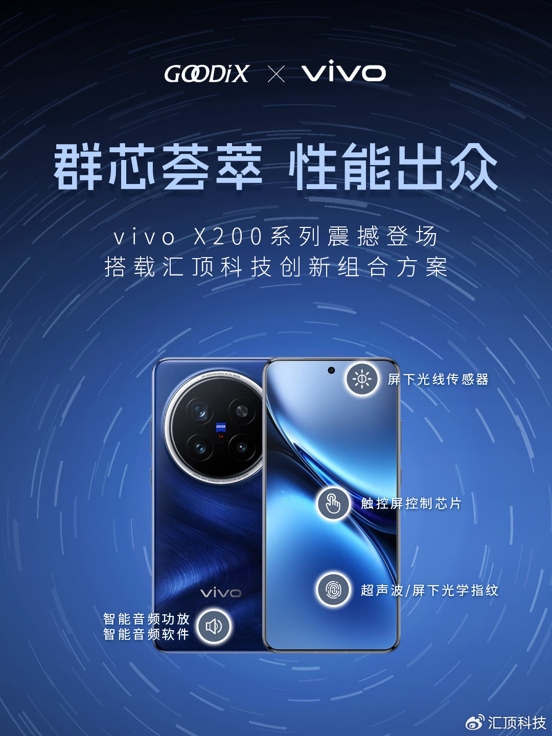 汇顶科技昨晚发文“认领” vivo X200 系列手机传感器配件,包括:智能音频功放 / 智能音频软件、屏下光线传感器、触控屏控制芯片、超声波 / 屏下光学指纹。